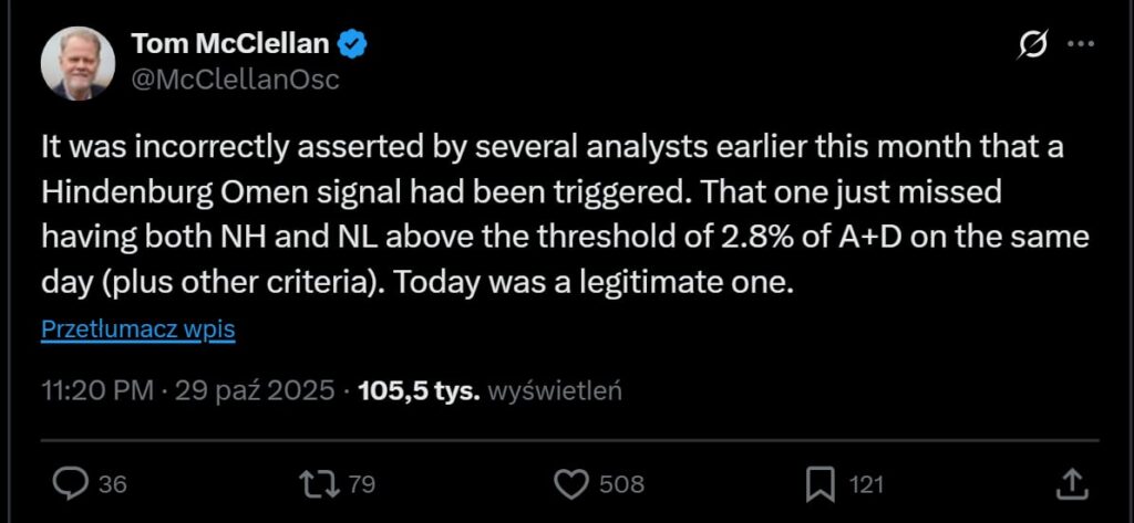 Tom McClellan potwierdził wczorajszy wskaźnik: ’Na początku tego miesiąca kilku analityków błędnie stwierdziło, że wskaźnik Hindenburg Omen został aktywowany. W rzeczywistości tamten sygnał nie spełnił wszystkich warunków – zabrakło jednoczesnego przekroczenia progu 2,8% nowych maksimów (NH) i minimów (NL) w stosunku do liczby akcji rosnących i spadających (A+D), a także kilku innych kryteriów. Dzisiejszy sygnał natomiast można uznać za pełnoprawny i zgodny z regułami.’