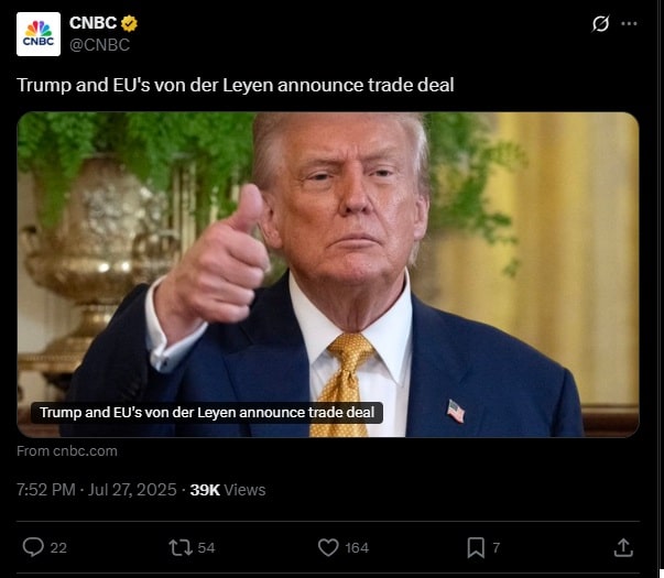 Kilka godzin temu prezydent Donald Trump i przewodnicząca Komisji Europejskiej Ursula von der Leyen ogłosili, że Stany Zjednoczone osiągnęły porozumienie handlowe z Unią Europejską. Przed spotkaniem Trump ocenił, że szanse na zawarcie porozumienie to 50%. W przekazach medialnych pojawiały się zapowiedzi, że w przypadku niepowodzenia USA nałożą na towary z UE nawet 30% cła.