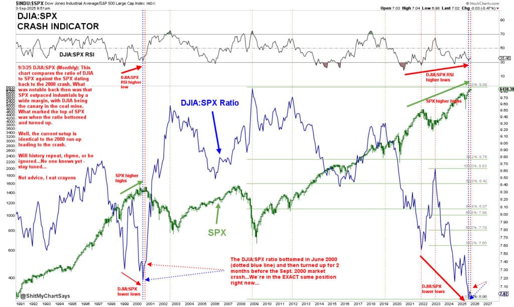 Przełom nastąpił, gdy relacja Dow do S&P spadła do dna i zaczęła się odbijać – co faktycznie było sygnałem, że nadchodzi koniec hossy. Dziś ta sama sytuacja powtarza się niemal punkt w punkt. Wskaźnik dotknął dołka w lipcu i drugi miesiąc z rzędu odbija w górę. Brzmi jak dzwon żałobny? Trudno nie odnieść takiego wrażenia.