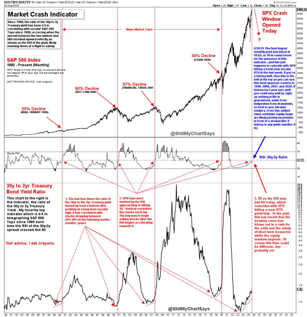 Co w tym szczególnego? Końcowy odczyt RSI relacji 2 do 10-letnich rentowności USA, za sierpień wskazał poziom 49,65 (w uproszczeniu: 50). Dokładnie taki sam sygnał poprzedzał największe tąpnięcia ostatnich dekad: recesję na początku lat 90., pęknięcie bańki dot-com w 2000, kryzys finansowy w 2007 i gwałtowne załamanie z 2020 roku. Teraz – niemal w tym samym momencie – indeks S&P 500 spada z historycznych szczytów.