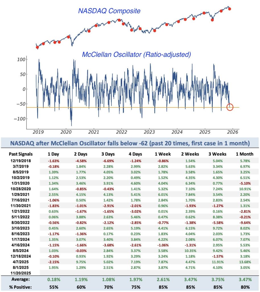 Rynek z natury częściej rośnie niż spada, więc prawdopodobieństwo zwyżki po niemal każdym wydarzeniu jest z definicji wyższe. Krótkoterminowo wskaźniki wyglądają jak po olbrzymim wstrząsie. Oscylator McClellana dla Nasdaq spadł poniżej -80, sygnalizując skrajne wyprzedanie. To poziom, który w trakcie tej hossy konsekwentnie poprzedzał odbicia.