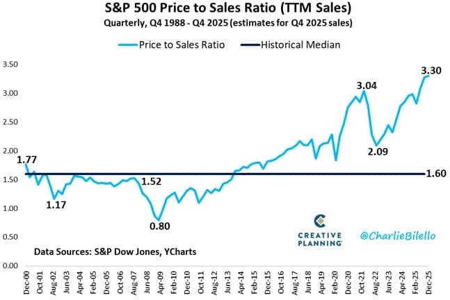 Nie od dziś wiadomo, że hossa amerykańskich akcji urosła do kolosalnych rozmiarów, windując wyceny do ciężkich do zaakceptowania poziomów. Wskaźnik ceny do sprzedaży dla S&P 500 jest najwyższy w historii, co oznacza, że inwestorzy płacą za udziały w amerykańskich firmach rekordowe poziomy w historii – w relacji do ich przychodów.