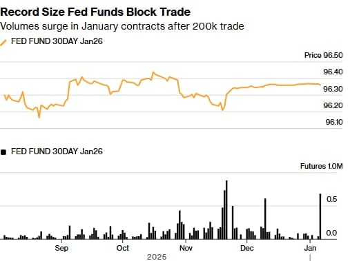 Według danych potwierdzonych przez operatora giełdy kontraktów na amerykańskie rentowności treasuries, CME, ostatnia transakcja na 200 tysięcy kontraktów Fed Funds Futures jest największą w historii tego rynku. Już sama jej skala wymusza pytanie, czy ktoś próbuje przestawić rynkowe oczekiwania wobec Rezerwy Federalnej, czy raczej zamyka ogromną pozycję. W pozycji tej pracuje prawdopodonie minimum 100 mln USD, choć realnie margin może wynosić raczej 150 do 250 mln USD.
