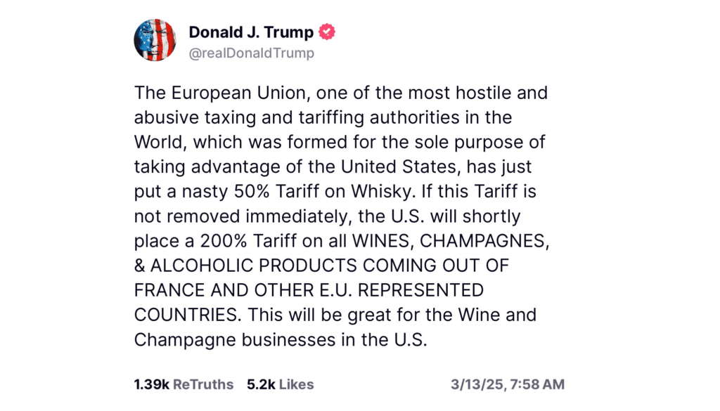 Gigantyczne cła na europejski alkohol byłyby rujnujące dla branży – wskazują francuscy winiarze. Czyli jedna z bardziej (czy wręcz nieproporcjonalnie) wpływowych politycznie branż producenckich w UE. Cła te wywołały kroki organów unijnych, które miały w jak najbardziej bolesny sposób odpowiedzieć na radykalną zmianę paradygmatu polityki celnej i handlowej USA przez Trumpa. Również w odniesieniu do Unii.
