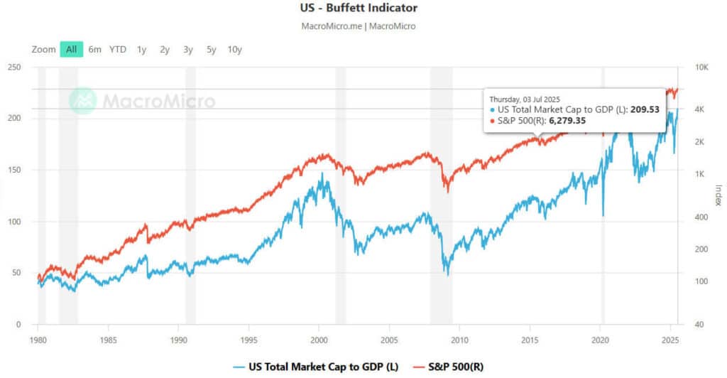 Jeśli rynek ma dalej rosnąć, będzie potrzebował więcej niż tylko płynności. Potrzebne będą realne fundamenty: wzrost zysków, stabilność fiskalna i polityczna wiarygodność. A z tym — jak pokazuje obecna sytuacja — bywa różnie. Wskaźnik Buffetta świeci na czerwono.