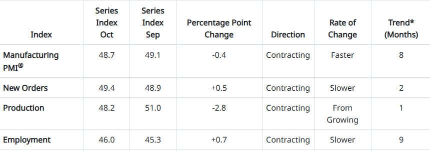 USA – dane przemysłowe ISM Manufacturing PMI za październik: 48,7 (prognoza 49,5; poprzednio 49,1)