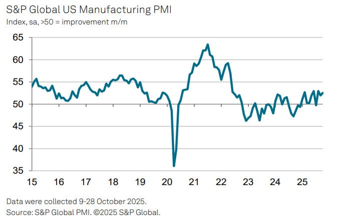 - S&P Global Manufacturing PMI (finalny, październik): 52,5 (prognoza 52,2; poprzednio 52,2)