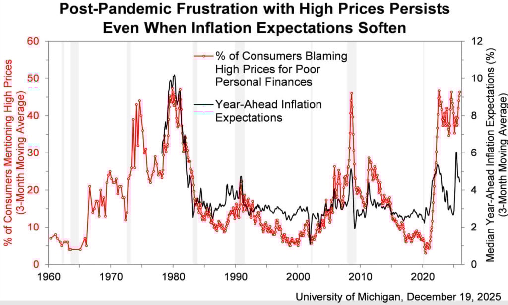 Na koniec roku amerykański konsument wysyła sygnały mieszane. Niby coś drgnęło, ale wciąż trudno mówić o przełomie i odbiciu nastrojów. Dane z grudniowego badania nastrojów konsumenckich przez University of Michigan potwierdziły wczesny odczyt z początku miesiąca: indeks wzrósł symbolicznie, o mniej niż dwa punkty względem listopada, a więc w granicach statystycznego błędu. Innymi słowy, poprawa jest tak delikatna, że przeciętny Amerykanin raczej jej nie odczuwa.