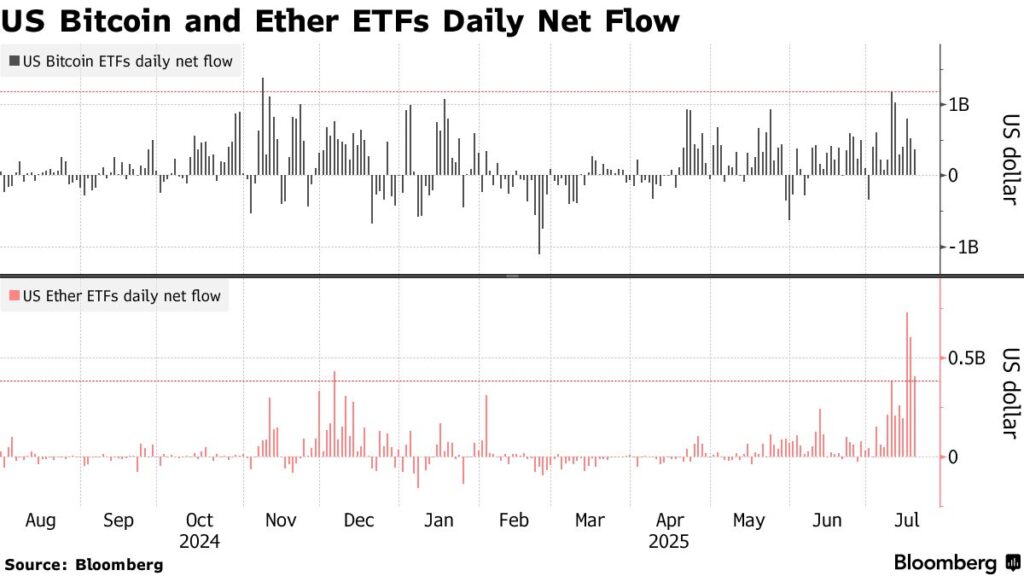 Między innymi IPO stablecoinowego giganta Circle, rozmowy legislacyjne w Waszyngtonie i impulsy ze strony instytucji, które jeszcze do niedawna trzymały się z dala od wszystkiego, co 'kryptowalutowe’. Według danych 10x Research, tuż przed lipcowym szczytem Bitcoina duzi gracze (portfele zawierające ponad 10 000 BTC) zgromadzili blisko 47 000 BTC. Gdy kurs sięgnął szczytu – zaczęli realizować zyski, co z kolei dało impuls do korekty w okolice 118 000 USD. Klasyka gatunku, w wykonaniu graczy z t dostępem do terminali Bloomberga.