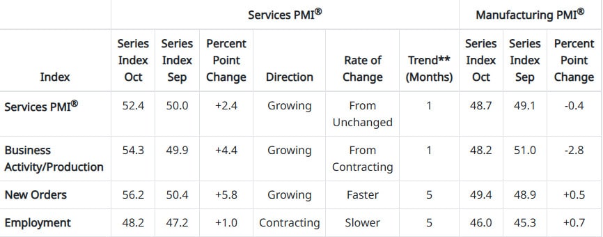 Nie da się ukryć, że to właśnie usługi – odpowiadające za ponad dwie trzecie amerykańskiego PKB – stanowią dziś swoisty barometr nastrojów biznesowych. W październiku poprawiły się niemal wszystkie główne wskaźniki składające się na indeks. Aktywność biznesowa wzrosła do 54,3 pkt, a nowe zamówienia osiągnęły 56,2 pkt – najwyższy wynik od roku. To znak, że popyt konsumencki nadal ma się dobrze, nawet jeśli przedsiębiorcy patrzą w przyszłość z pewną rezerwą. Pełny raport ISM przeczytamy tutaj.