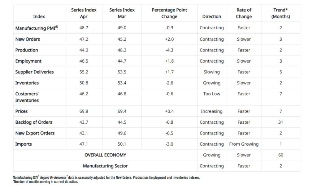 Raport ISM przemysłu za kwiecień: 48.7 vs 47.9 oczekiwań i 49 w marcu