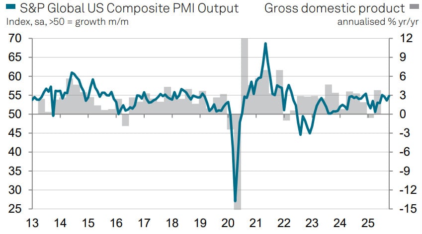Najmocniejszym punktem pozostają usługi – segment, który niezmiennie napędza amerykański rynek pracy i konsumpcję. Popyt krajowy rośnie w najlepszym tempie od początku roku, a firmy sygnalizują solidne zwiększenie nowych zamówień. Produkcja przemysłowa również odbiła, choć wciąż widać ślady spowolnienia po wcześniejszych zawirowaniach związanych z ograniczeniami handlowymi i skutkami częściowego „shutdownu” rządu.