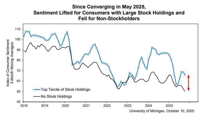 Mimo lekkiej poprawy w realnych wskaźnikach gospodarczych, inflacja i wysokie ceny wciąż pozostają głównym źródłem niepokoju. Co ciekawe, prawie nikt nie wiąże obecnego spowolnienia z niedawnym „shutdownem” rządu federalnego – tylko 2% respondentów spontanicznie o nim wspomniało, w porównaniu z 10% podczas długiego zamknięcia administracji w 2019 roku.