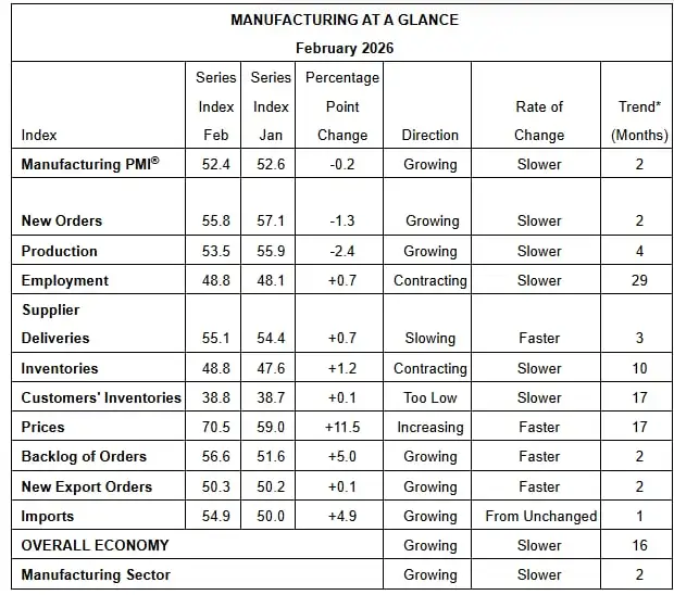 Wskaźnik PMI dla przemysłu osiągnął 52,4%, minimalnie spadając z 52,6% w styczniu. Indeks nowych zamówień wyniósł 55,8%, spadając z 57,1%, co sugeruje, że popyt rośnie, ale wolniej niż miesiąc wcześniej. Produkcja wciąż rośnie, ale tempo również spowolniło w porównaniu z 55,9% w styczniu.