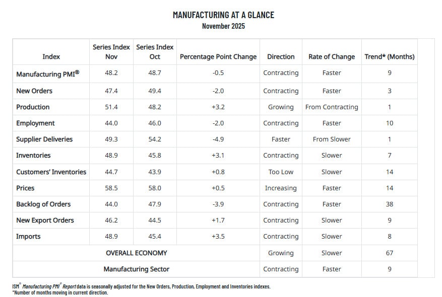 Raport ISM USA dla przemysłu (za listopad): 48,2 (Prognoza 49, Poprzednio 48,7)