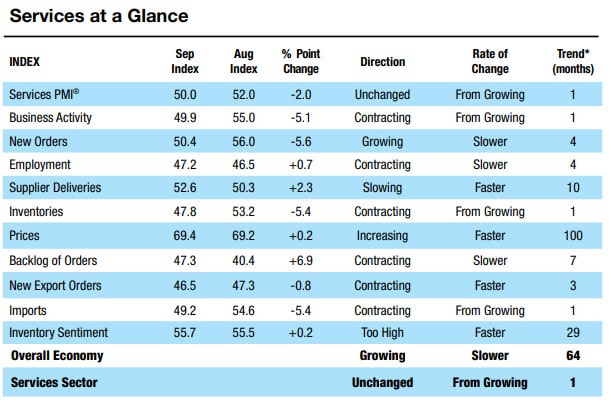 Wrzesień przyniósł rzadko spotykaną pauzę w amerykańskiej gospodarce usługowej. Indeks ISM Services PMI zatrzymał się dokładnie na poziomie 50 punktów … Czyli granicy między wzrostem a kurczeniem się sektora. To pierwszy raz od ponad dekady, kiedy wskaźnik balansuje tak precyzyjnie na neutralnym poziomie.