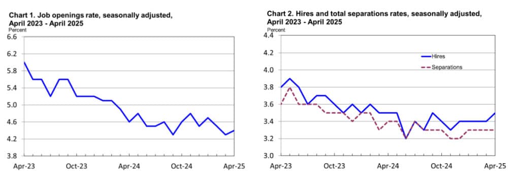 W kwietniu liczba wolnych miejsc pracy w Stanach Zjednoczonych utrzymała się na stabilnym poziomie 7,4 miliona – wynika z najnowszych danych opublikowanych przez Biuro Statystyki Pracy USA (BLS). Wskaźnik wakatów nie uległ zmianie i wyniósł 4,4%. Choć w większości branż nie zanotowano większych wahań, spadek liczby ofert pracy odnotowano w sektorze zakwaterowania i gastronomii (spadek o 135 tys.) oraz w edukacji publicznej na szczeblu stanowym i lokalnym (spadek o 51 tys.). Wzrost liczby wakatów wystąpił natomiast w branży rozrywkowej i rekreacyjnej (wzrost o 43 tys.) oraz w górnictwie i leśnictwie (wzrost o 10 tys.). Równie stabilnie wyglądała aktywność rekrutacyjna – liczba zatrudnień wyniosła 5,6 mln, a wskaźnik zatrudnień pozostał na poziomie 3,5%.