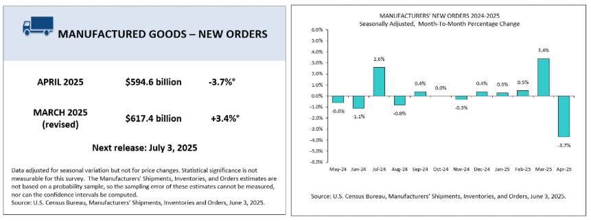 Według najnowszych danych opublikowanych przez amerykańskie Biuro Spisu Ludności, wartość nowych zamówień na dobra przemysłowe w USA spadła w kwietniu o 22,8 miliarda dolarów, czyli 3,7%, do poziomu 594,6 miliarda dolarów. To w dużej mierze efekt taryf. To pierwszy spadek po czterech kolejnych miesiącach wzrostów i nastąpił po marcowym wzroście o 3,4%. Wysyłki towarów również wykazały spadek – drugi miesiąc z rzęd.u. Spadły o 1,8 miliarda dolarów (0,3%) m/m do 598,9 miliarda dolarów, po wcześniejszym spadku o 0,2% w marcu.