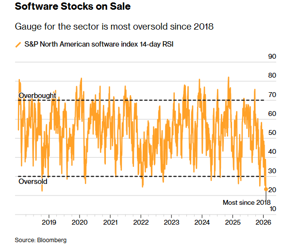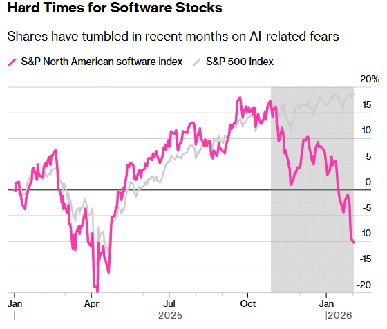 Skala ruchu znajduje odzwierciedlenie w danych sektorowych. S&P North American Software Index znajduje się na trzecim tygodniu spadków z rzędu, a sam styczeń zakończył 15% spadkiem, co jest najgorszym miesięcznym wynikiem dla sektora od października 2008 roku. To ważny punkt odniesienia: obecna przecena zaczyna być porównywana z okresem globalnego kryzysu finansowego, mimo że nie towarzyszy jej załamanie systemowe.