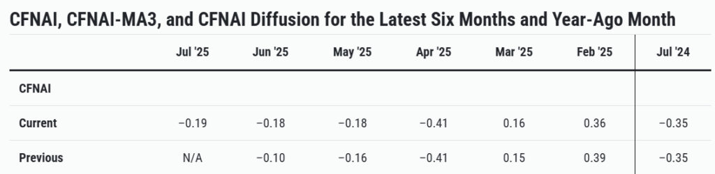 Podczas gdy Teksas świętuje przyspieszenie, ogólnokrajowy obraz gospodarki prezentowany przez Chicago Fed National Activity Index (CFNAI) wygląda zdecydowanie mniej okazale. Lipcowa wartość indeksu spadła do –0,19 (z –0,18 miesiąc wcześniej), co oznacza, że aktywność gospodarcza wciąż pozostaje poniżej długoterminowego trendu. To już czwarty taki miesiąc z rzędu.