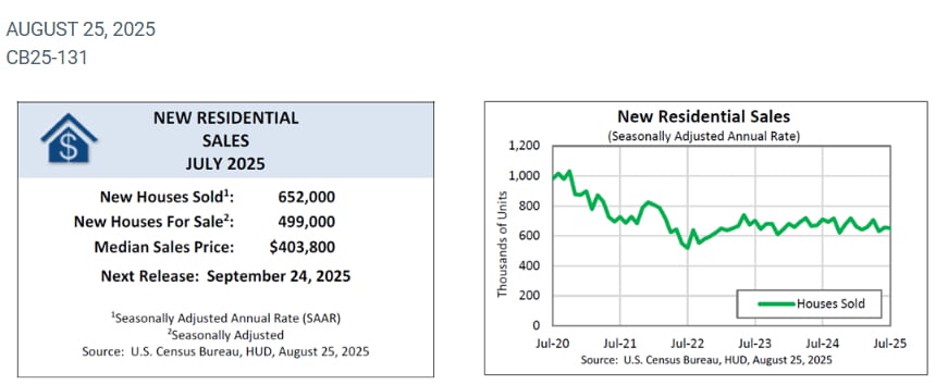 Na tym tle ciekawie prezentują się dane z rynku nowych domów. Sprzedaż w lipcu wyniosła 652 tys. w ujęciu rocznym, co oznacza delikatny spadek o 0,6 proc. wobec czerwca i aż o 8,2 proc. w porównaniu z lipcem 2024 r. Z jednej strony to rozczarowanie, z drugiej – nadal mówimy o wyniku powyżej prognoz.