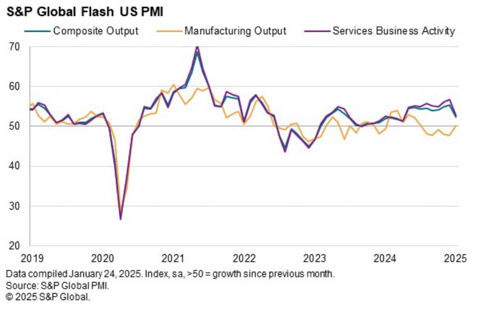 Produkcja i popyt Główny indeks S&P Global US PMI Composite Output Index spadł z 55,4 w grudniu do najniższego od dziewięciu miesięcy poziomu 52,4 w styczniu, zgodnie ze wstępnym odczytem, który opiera się na około 85% odpowiedzi ankietowych. Spowolnienie koncentrowało się na gospodarce usługowej, gdzie produkcja rosła w najwolniejszym tempie od kwietnia ubiegłego roku. Mimo to utrzymała ekspansję sektora przez dwadzieścia cztery kolejne miesiące.