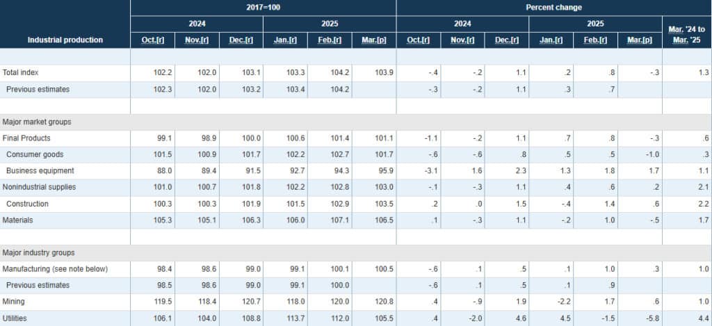 Całkowita produkcja przemysłowa w USA, w marcu osiągnęła 103,9% średniego poziomu z 2017 roku, plasując ją o 1,3% wyżej r/r. Jednocześnie jednak wykorzystanie mocy produkcyjnych spadło do poziomu 77,8%, czyli o 1,8 punktu procentowego poniżej długoterminowej średniej z lat 1972–2024.