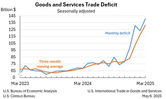 Bilans handlowy USA: -140.5 mld USD (prognoza -137.15 mld USD, w marcu-122.7 mld USD, zrewidowane do: -123.2 mld USD)