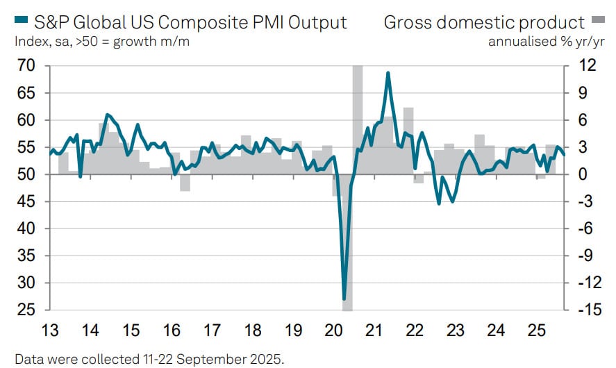 Zbiorczy wskaźnik S&P Global US PMI Composite spadł we wrześniu nieznacznie. Nie dramatycznie – poziom powyżej 50 nadal oznacza rozwój – ale dynamika ewidentnie słabnie. Co ciekawe, cały trzeci kwartał, mimo wrześniowego ochłodzenia, wypadł najlepiej od końcówki 2024 r. Innymi słowy, mamy do czynienia nie tyle z hamulcem, ile z lekkim zdjęciem nogi z gazu.