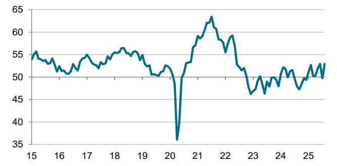 Sierpień przyniósł wyraźne odbicie w amerykańskim sektorze przemysłowym. Wskaźnik S&P Global US Manufacturing PMI wzrósł do 53. Czyli najwyżej od maja 2022 roku. To sygnał, że fabryki w Stanach znów zaczęły pracować na wyższych obrotach. Za poprawą kryje się jednak nie tylko rosnący popyt, ale także gromadzenie zapasów – przedsiębiorstwa wolą dziś zapełnić magazyny, zanim ceny materiałów i komponentów wzrosną jeszcze bardziej.
