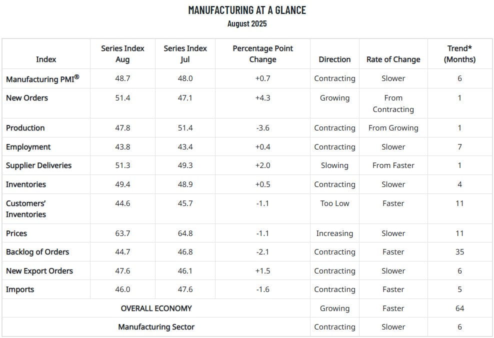 ISM przemysłu za sierpień: 48,7 (prognoza: 49, poprzednio: 48,0)