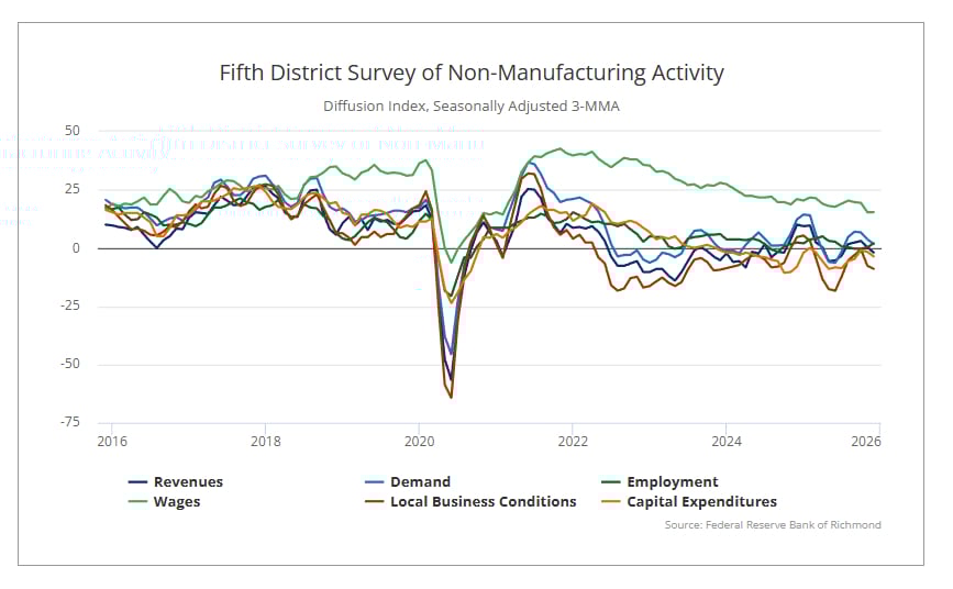 Grudniowe badanie Fed z Richmond pokazuje wyraźne schłodzenie aktywności w sektorze usług w Piątym Dystrykcie, choć nie wszystko wygląda pesymistycznie. Indeks przychodów obniżył się do minus 6 z minus 4, a wskaźnik popytu spadł do minus 3 z poziomu plus 4 miesiąc wcześniej. To sygnał, że bieżąca koniunktura powoli wytraca impet, po relatywnie stabilnej jesieni.