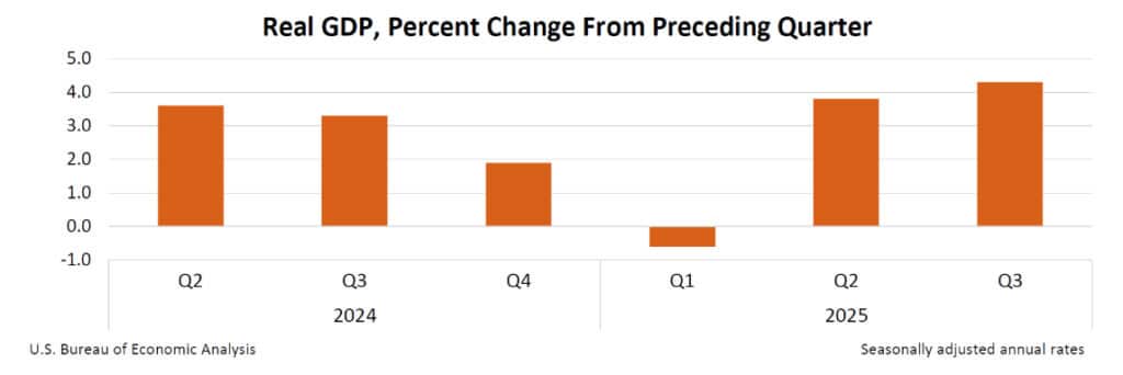 Trzeci kwartał 2025 roku przyniósł zaskakująco solidny obraz gospodarki USA. Realny PKB wzrósł w tempie 4,3 procent w ujęciu zanualizowanym, wyraźnie szybciej niż 3,8 procent w poprzednim kwartale. To wynik, który na Wall Street trudno zignorować, zwłaszcza po miesiącach narzekań na gaśnięcie impulsu wzrostowego.