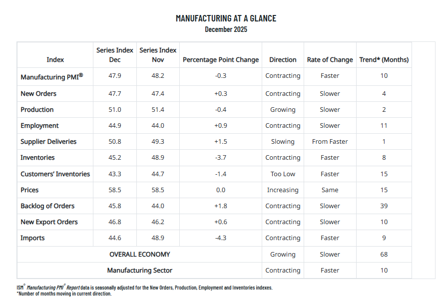 Ostatnie dane z sektora przemysłowego w USA pokazują, że fabryki kończą 2025 rok w wyraźnym spowolnieniu. W grudniu indeks aktywności fabryk ISM Manufacturing PMI spadł do 47,9, najniżej od października 2024 roku, sygnalizując kolejny miesiąc kurczenia się aktywności produkcyjnej. Ekonomiści spodziewali się lższejszego spadku do 48,4, więc rzeczywistość okazała się nieco gorsza od prognoz. Ale Wall Street wzięło to za dobrą monetę, widząc w raporcie nadzieje na mocniejsze cięcia stóp w Fed. Indeksy giełdowe rosną.