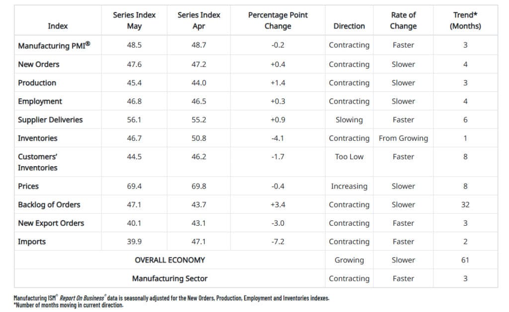 Majowy wskaźnik PMI dla amerykańskiego sektora przemysłowego wyniósł 48,5 pkt, nieco poniżej kwietniowego odczytu 48,7 pkt. Choć sam spadek wydaje się symboliczny, to sam fakt pozostania poniżej kluczowej granicy 50 pkt potwierdza, że amerykański przemysł nadal znajduje się w fazie kurczenia się. Na domiar złego aż 57% amerykańskiego PKB przemysłowego znalazło się w strefie kontrakcji, w porównaniu do 41% w kwietniu. Jest to najwyższy udział od miesięcy, co stanowi wyraźny sygnał ostrzegawczy dla inwestorów i decydentów gospodarczych.