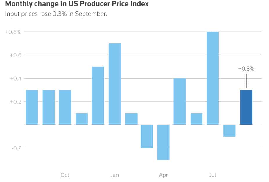 Wpływ mają też cła. Ciągłe nakładanie taryf na import przez Prezydenta Trumpa przełożyło się na wyższe ceny codziennych produktów. To widać w inflacji producentów (PPI), która we wrześniu odbiła do 0,3% (po wzroście cen energii o 3,5% i żywności o 1,1%), utrzymując roczną dynamikę na poziomie 2,7%. Konsument czuje to w kieszeni.