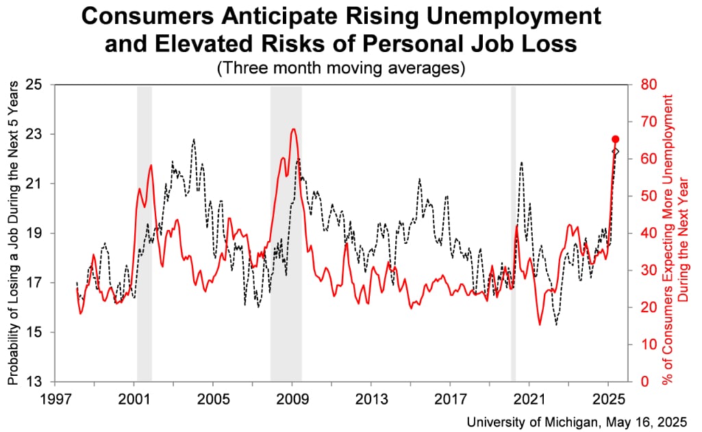 Taryfy celne były spontanicznie wspominane przez prawie 75% ankietowanych konsumentów, wobec około 60% w kwietniu. To jasno sugeruje, że temat wojny handlowej w realnej gospodarce dopiero nabiera rozpędu. Niepewność związana z polityką handlową wciąż dominuje w postrzeganiu gospodarki przez konsumentów.