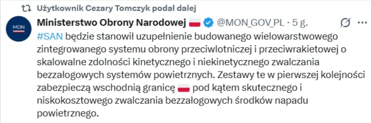 Ekspert do spraw obronności Jarosław Wolski zauważył na platformie X, że tak duża liczba pojazdów pozwoli na nasycenie terenu systemami zdolnymi do zwalczania rojów dronów, co obecnie jest największym wyzwaniem na współczesnym polu walki. Choć obecność komponentów zagranicznych wynika z ograniczonych mocy produkcyjnych polskich zakładów, ekspert ocenia to rozwiązanie jako optymalne pod względem operacyjnym. SAN ma służyć jako stałe zabezpieczenie granicy i ekonomiczna alternatywa dla drogich rakiet w odpieraniu masowych ataków. Całość wypowiedzi Wolskiego ma charakter umiarkowanie optymistyczny, łącząc uznanie dla nowoczesnej architektury systemu z realistyczną oceną koniecznych kompromisów technicznych. Ekspert docenia „szycie systemu na miarę” współczesnego pola walki, choć nie ukrywa, że jego ostateczny kształt wymusił pośpiech i brak krajowych alternatyw dla niektórych podzespołów. W efekcie SAN jawi się jako system niedoskonały teoretycznie, ale idealnie dopasowany do obecnych, krytycznych potrzeb Wojska Polskiego.