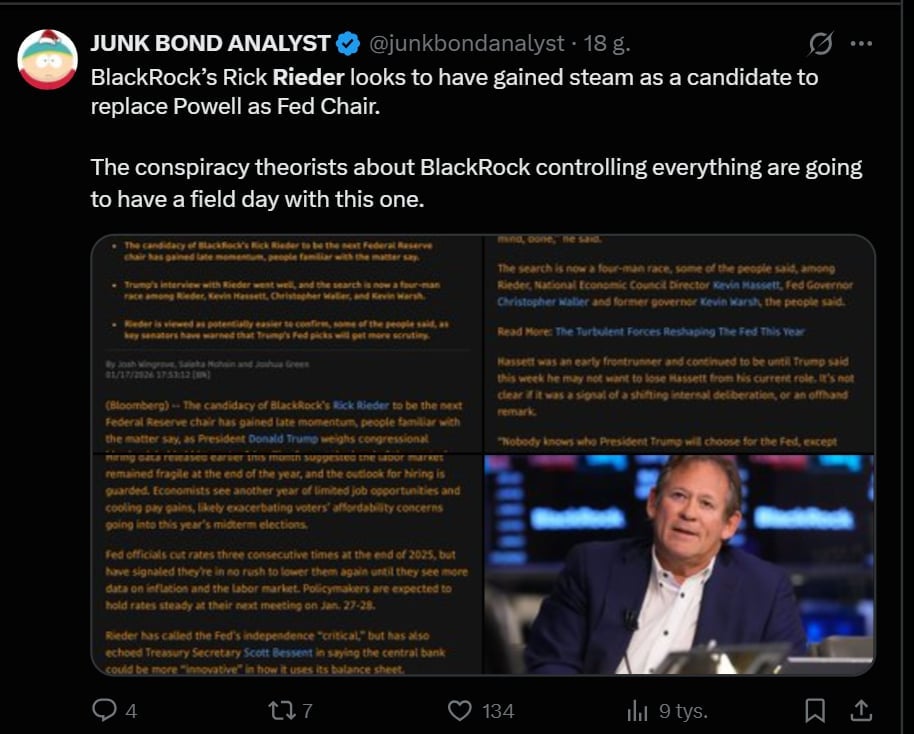 Hassett podkreślił, że rozmowy na ten temat trwają od dawna i nie zapadła jeszcze ostateczna decyzja. Jak zaznaczył, wybór nie dotyczy ambicji personalnych, lecz strategicznego rozmieszczenia wpływu władzy wykonawczej. Jednocześnie rosną szanse objęcia kierownictwa w Fed przez Ricka Riedera z BlackRock. Hassett o przyszłości w administracji Trumpa i Fed mówił w Fox News: