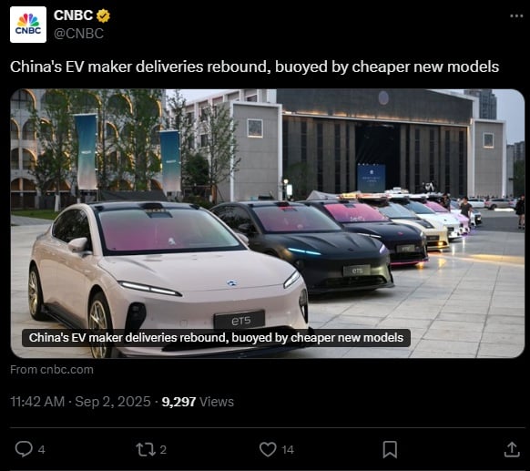 Najnowsze wyniki sprzedaży kilku czołowych chińskich marek pokazują, że pozytywny trend wciąż się utrzymuje. Firma BYD ogłosiła, że w sierpniu sprzedała 371 501 pojazdów. Oznacza to, że w porównaniu do analogicznego okresu w poprzednim roku BYD sprzedał aż 22% aut. Z kolei Nio, Leapmotor i Xpeng ustanowiły nowe rekordy dostaw.