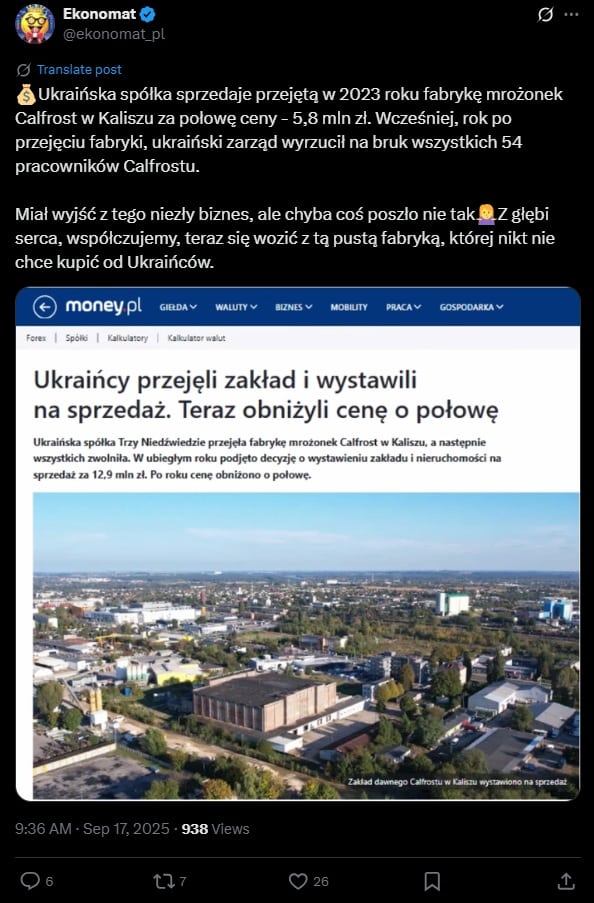 W ostatnich dniach zrobiło się bardzo głośno o sytuacji firmy Calfrost. Przedsiębiorstw z Kalisza produkujące mrożonki w 2023 roku trafiło w ręce Ukraińców. Firma Trzy Niedźwiedzie kupiła wtedy Nordis, do której należał kaliski Clafrost. Kierownictwo ukraińskiej firmy raczej nie dopisze sobie tego zakupu do listy sukcesów.
