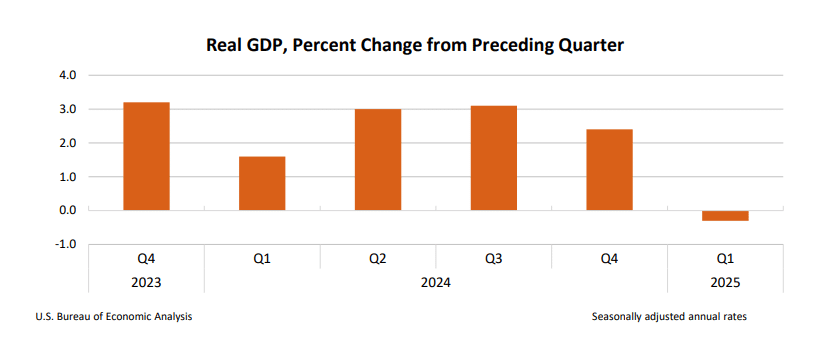 Raport amerykańskiego Departamentu Handlu pokazuje, że Produkt Krajowy Brutto skurczył się w I kwartale o 0,3%. To pierwszy minus od trzech lat. W centrum uwagi również jest skok importu aż o 41,3%. Wywołany gorączkowym kupowaniem towarów przed wejściem w życie nowych ceł. Sam deficyt w handlu towarowym odjął od wzrostu aż 4,83 punktu procentowego, z czego ekonomiści wnioskują że statystyczna „dziura” powstała głównie na skutek jednorazowego sprintu firm po tańszy towar.