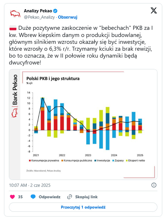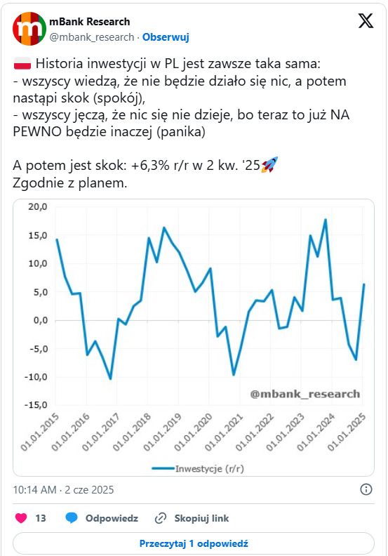 Niektórzy wskazują na rosnące wydatki publiczne i obronne jako główne źródła tej dynamiki, co jednak nie zmienia faktu, że rozpęd inwestycyjny może wkrótce rozlać się szerzej po gospodarce. Wszystko to przy perspektywie kolejnych cięć stóp procentowych NBP w drugiej połowie roku.