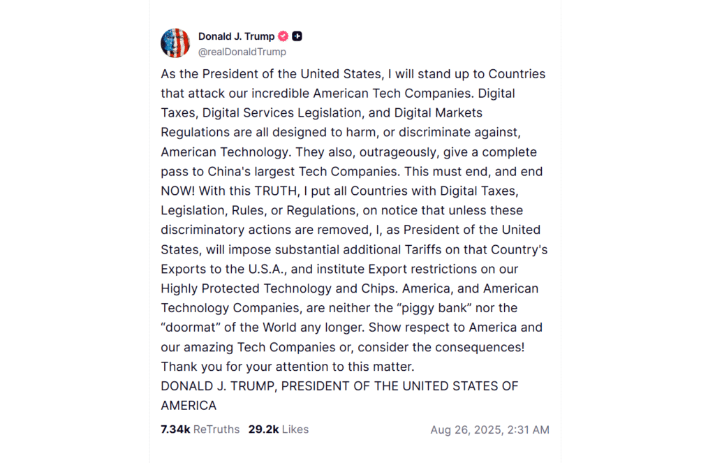 Donald Trump ogłosił dzisiaj, że na kraje nakładające podatki na amerykańskie firmy technologiczne – w szczególności te skrojone precyzyjnie po to, by sięgnąć do kieszeni koncernów tzw. Big Tech-u – spadną nowe cła oraz inne retorsje. Niewypowiedzianym, lecz oczywistym adresatem tej groźby jest Unia Europejska. Właśnie UE jest bowiem w awangardzie prób opodatkowania przychodów znanych firmy z branży IT, jak Amazon, Google, Facebook czy X/Twitter.