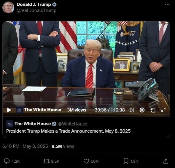 Wczoraj Donald Trump ogłosił uzgodnienie umowy handlowej ze znacznie większym graczem, który liczy się na arenie międzynarodowej. Prezydent USA ogłosił tę wiadomość w swoich mediach społecznościowych. Umowę potwierdził również Kier Stramer, premier Wielkiej Brytanii. Póki nie są znane szczegóły umowy. CNN Business podaje, że utrzymane zostanie 10% cło na import z Wielkiej Brytanii, ale samochody z wysp mają być opodatkowane według niższej stawki. W tym przypadku stawka ma spaść z 25% do 10%.