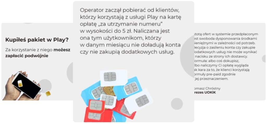 UOKiK wział pod lupę dwie oferty od spółki P4 (Play). Chodzi o „Play Na Kartę OdNowa” oraz „Play na kartę 3.0”. Jak ustalił urząd, operator zaczął pobierać od swoich klientów opłatę za utrzymanie numeru. Zdaniem UOKiK operator sieci komórkowej wprowadził taki zapis jednostronnie, bez ustawowej podstawy prawnej oraz braku klauzuli, która umożliwia spółce stosowanie takich zmian. Instytucja oceniła, że takie praktyki naruszają zbiorowy interes klientów sieci.