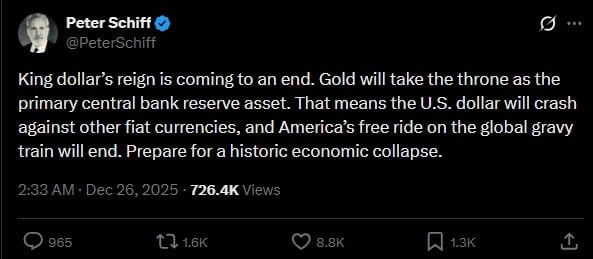 Popularny ekonomista w jednym z najnowszych wpisów na X ocenia, że dominacja dolara jako globalne waluty dobiega końca. Tym samym na naszych oczach znika system finansowych, który funkcjonował od kilku dekad. Jak stwierdził Schiff „Panowanie króla dobiega końca”.
