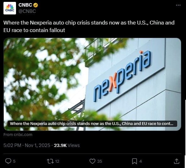 Wszystko z powodu zamieszania wokół firmy Nexperia, która ma siedzibę w Nijmegen w Holandii. Firma należy do chińskiej spółki Wingtech Technology. Kilka dni temu holenderski rząd zdecydował o przejęciu Nexperia z powodu obaw o bezpieczeństwo. Kilka miesięcy wcześniej rząd USA umieścił firmę na czarnej liście. W uzasadnieniu napisano, że podmiot jest podejrzany o „wspieranie chińskiego rządu w staraniach o przejęcie podmiotów dysponujących wrażliwymi możliwościami produkcji półprzewodników”.
