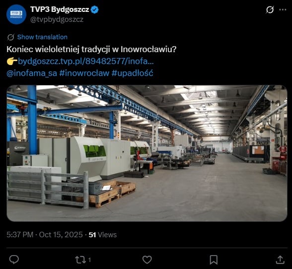 Firma Inofama z Inowrocławia kilka dni temu złożyła do sądu dwa wnioski. Pierwszy dotyczy rozpoczęcia postępowania restrukturyzacyjnego, a drugi upadłości. Podmiot działał od 1880 roku i był jednym z największych polskich zakładów, które zajmują się produkcją maszyn dla rolnictwa, ochrony środowiska oraz budownictwa. W 1991 roku firma stała się spółką Skarbu Państwa — INOFAMA S.A.