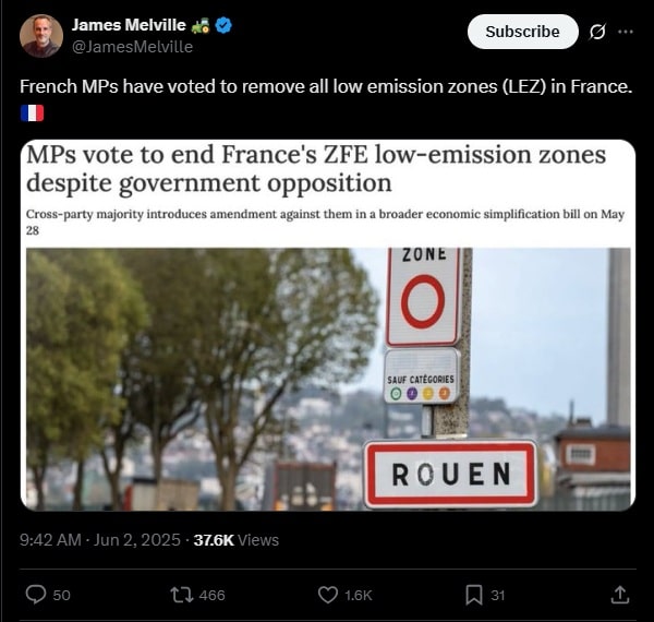 Na podobny ruch zdecydowała się Francja i to na znacznie większą skalę. Zgromadzenie Narodowe Francji kilka dni temu zagłosowało za zniesieniem SCT we wszystkich francuskich miastach. Politycy argumentowali przede wszystkim, że strefy czystego powietrza są niesprawiedliwe i wykluczają biedniejszych mieszkańców miast, którzy nie mogą pozwolić sobie na zakup nowego samochodu. Alexandre Jardin, który stworzył ruch Les #Gueux (Żebracy) ocenił, że SCT były złym pomysłem. Zdaniem Jardina „ekologia stała się sportem dla bogaczy”.